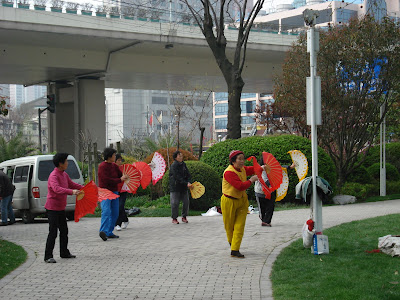 Одна группа занималась китайской гимнастикой тай чи. Другая группа танцевала под музыку, льющуюся из принесенного магнитофона. Третьи делали сложные комбинации с мечами. Особенно нам понравилась группа женщин, танцующих с веерами. Мы прямо-таки глаз не могли от них отвести, так плавно, красиво, а главное – самозабвенно они двигались.