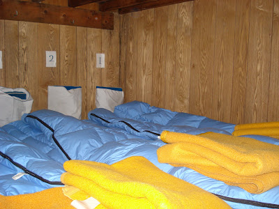 Надо сказать, что нам сильно повезло с нашей хижиной – по сравнению с остальными она была как пятизвездочный отель. Фуджи-сан отель – один из самых больших на горе, способный разместить на ночлег до 500 человек (обычно в хижинах порядка 200-300 мест). Хотя снаружи этого и не скажешь – так умело хижины встраивают в склон горы, наш дом был трехэтажным – на первом этаже размещалась столовая, а на втором и третьем – спальни с двухэтажными полатями. Каждые 11 спальных мест были огорожены – какое-никакое ощущение изолированности. Полы были застелены футонами, но каждому постояльцу, кроме одеяла и подушки выдавался еще и отдельный спальный мешок. Кроме того, так как мы ночевали в пятницу, и отель был занят не полностью – постояльцев размещали группками, оставляя по одному месту с каждой стороны свободным.