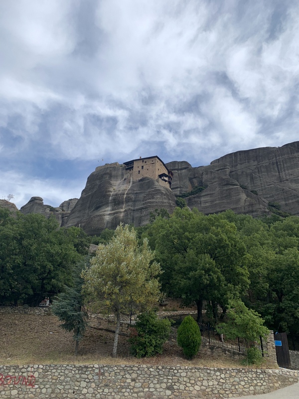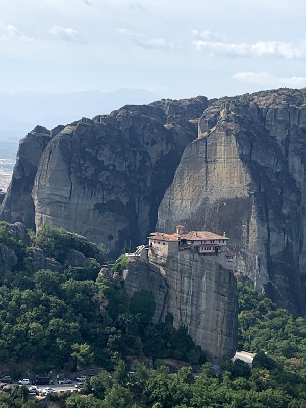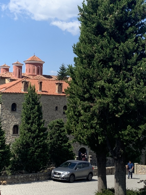После монастыря Святой Варвары дорога раздваивается. Налево идет дорога к самому большому монастырю Гранд Метеоры, самому первому монастырю этих мест, который основал монах Афанасий, пришедший в сюда с Афона. И рядом еще находится монастырь Святого Варлаама. Оба эти монастыря были сегодня закрыты, там шло какое-то празднование только для своих. Но мы все равно свернули туда, чтобы хоть издали на эти монастыри посмотреть.