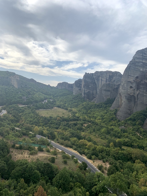 Спустились из монастыря вниз, проехали чуть-чуть по петляющей дороге и приехали на смотровую площадку, с которой открываются виды на Фессалийскую долину и высоченные скалы Метеор.