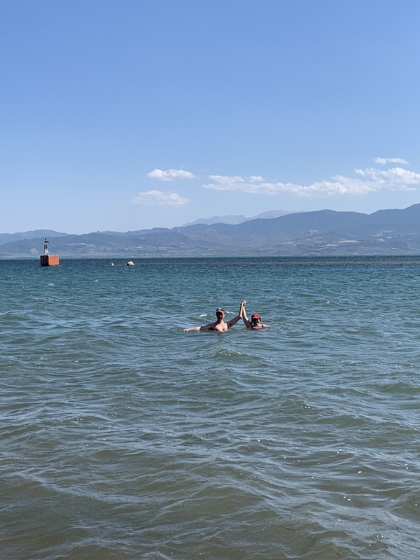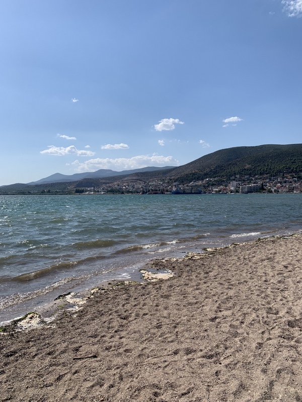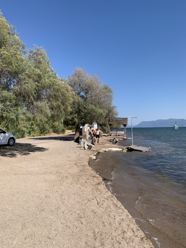 Дальше нам предстоял длинный переезд в город Дельфи. Когда мы спустились с гор, решили сделать небольшой крюк и заехать на море искупаться. Это было все тот же самый залив Эгейского моря, только в самой западной его точке.