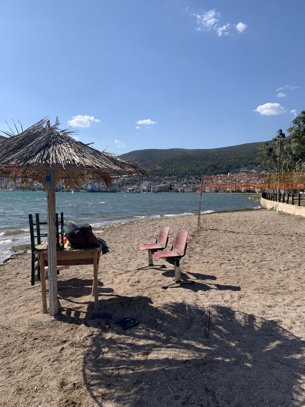 Чтобы добраться до этого моря нам сначала пришлось ехать по каким-то промышленным районам, потом с трудом выехали на узкую дорогу, идущую вдоль хайвея. Но нашли-таки этот пляж. Дикий он какой-то оказался. Ни одного человека. Только пара пустых машин стояла на парковке, но людей не было видно. Зато на пляже стояла совсем новая, видно, что только что построенная, кабинках для переодевания. И странные стулья, как в автобусе)))