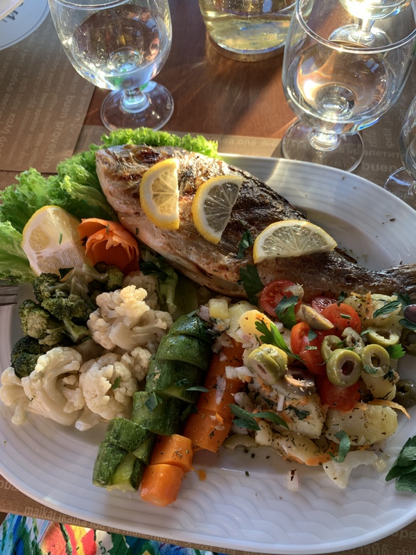 Но мы и сами не хотели сидеть внутри в такой замечательный вечер. Пошли дальше и нашли ещё одну таверну , где нас посадили на террасе.