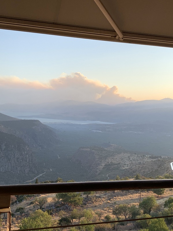 С нашего отельного балкона открывался вид на залив и горы полуострова Пелопоннес, куда мы должны были поехать завтра. Но что-то нам в этом виде не понравилось – вот это высокое красно-желтое облако было больше было похоже на дым от пожара.