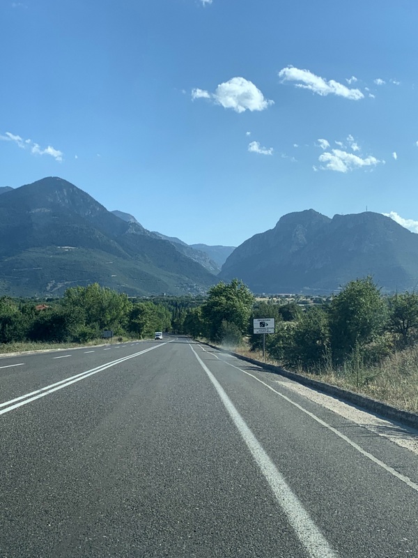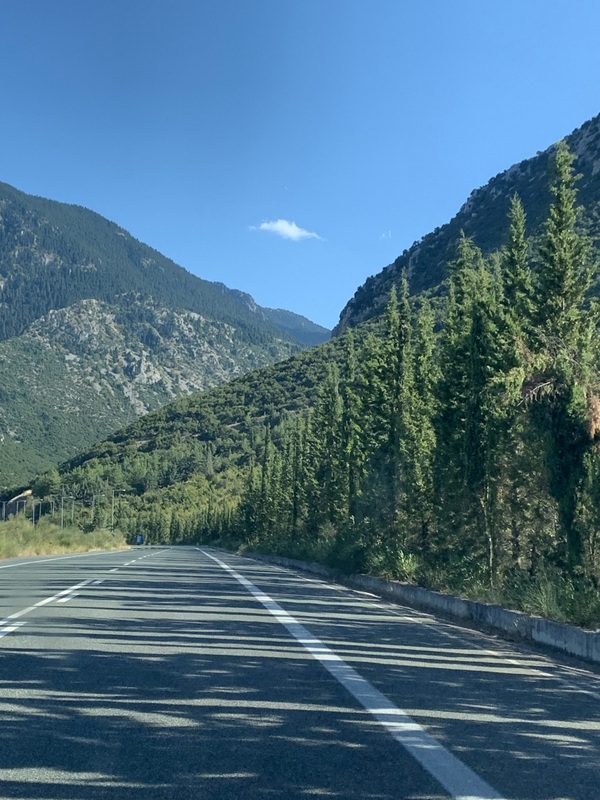 Ещё через час пути стали подъезжать к Дельфам. Я не ожидала, что этот город расположен так высоко в горах. Прямо уже когда совсем оставалось немного проехать, начался серпантин. Дорога, конечно, очень красивая, но даже чтобы въехать в сам город, пришлось виражи закладывать. Хорошо, что машин навстречу было очень мало.