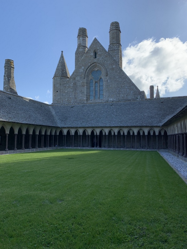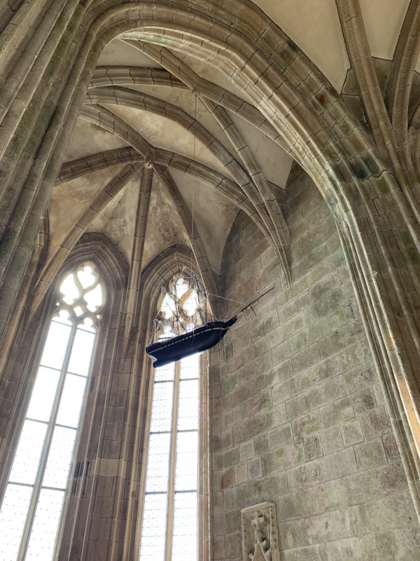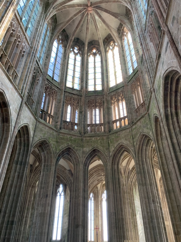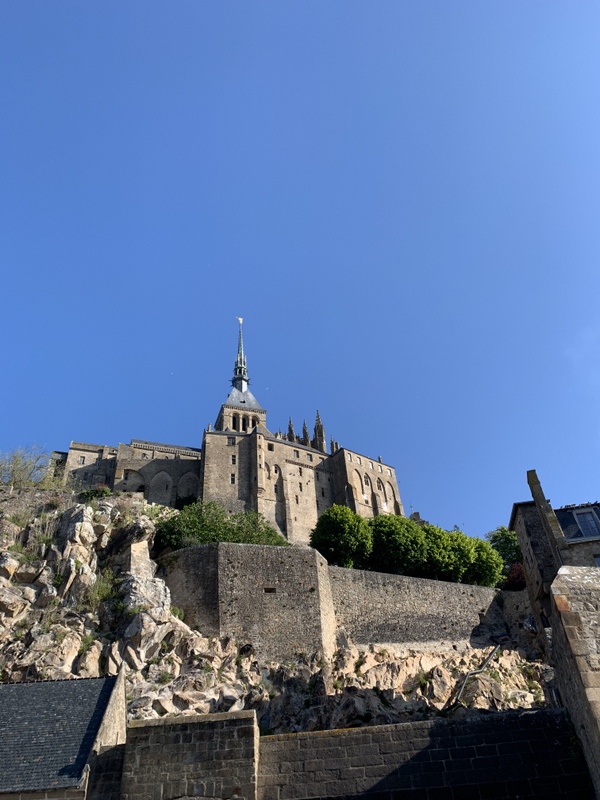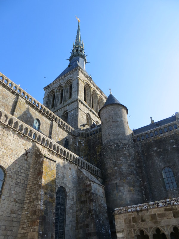 Наверху находится непосредственно аббатство Сэн-Мишель, которое было основано еще в 8 веке по приказу, согласно легенде, самого Архангела Михаила, который явился во сне местному епископу. Золотая фигура Архангела Михаила возвышается на шпиле собора.