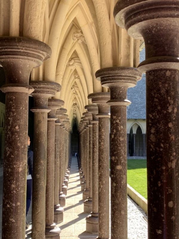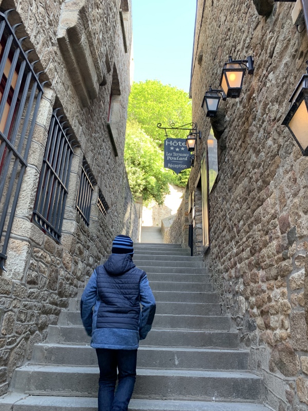 Это было очень мудрым решением приехать в аббатство очень рано утром – мы там оказались практически в одиночестве. Уже к обеду, когда мы шли к выходу, на узеньких улицах было не протолкнуться. А пока – весь остров был для нас одних. Мы смотрели, как просыпается город, открываются кафешки и сувенирные магазинчики. Мы еще пока с легкостью скакали по многочисленным каменным лестницам – прямых улиц в этом городе-горе практически нет. Вон там вдалеке на самой вышине – цель нашего похода.