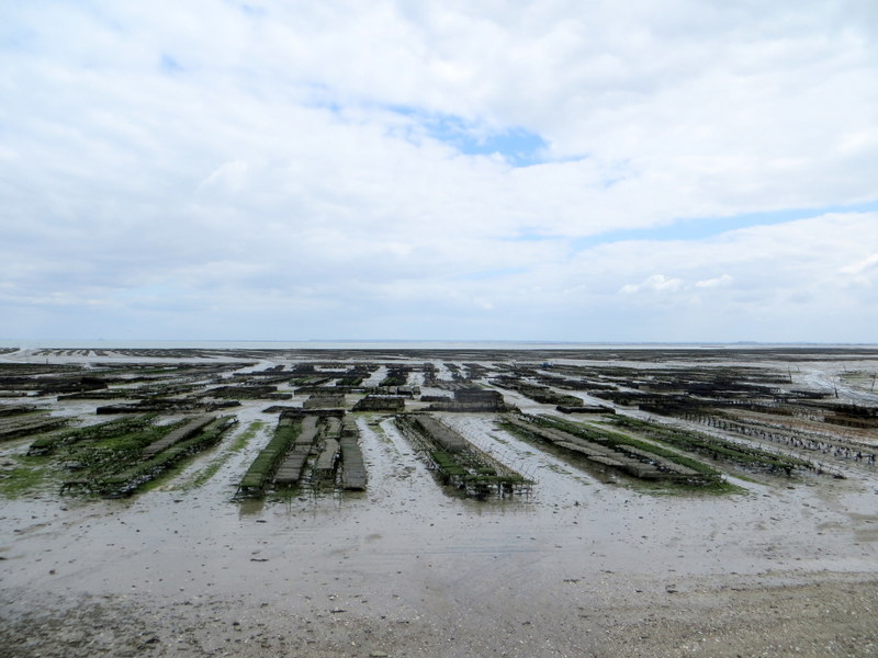 Если в Сэн-Мишеле мы наблюдали начинавшийся отлив, то здесь отлив был полный. Устричные фермы, которые обычно находятся глубоко в воде, обнажились полностью. И можно было изучать устройство устричного хозяйства.