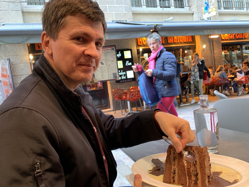 После долгой прогулки полагается что? – конечно же, награда. На фотографии как-то не видно размеров этого кусочка торта, хотя вот Денис ложку приложил для пропорций. Но поверьте, кусок был огроменный. Я, наверное, первый раз такие размеры встречала. Ничего, мужчины мои справились.