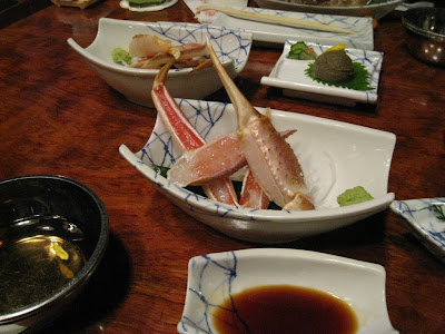 Ну, а теперь перейдем непосредственно к еде. Как вы уже, наверное, догадались, непременным ингредиентом каждого блюда этого ресторана (за исключением десертов) является краб. На первое у нас был краб вареный – на мой вкус, самый вкусный способ приготовления краба. Эх, к нему бы еще топленого теплого маслица, как в любимом нашем американском ресторане Joe’s Crab Shack… Но нет, здесь вареного краба подают со специальным соусом, смеси соевого соуса и сладкого саке.