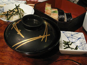 И еще один суп нам подали в самом конце – японский прозрачный суп с легким, практически без всякого вкуса бульоном. Но зато с куском большой крабовой клешни.