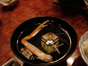Следующее блюдо – сашими из краба, или, говоря по-русски, краб сырой. Это, конечно, совсем на любителя. Я, вообще-то многое сашими ем с удовольствием – из лосося, или тунца, например. Но крабовое сашими мне, честно говоря, не очень пришлось по душе. Но где русские люди не пропадали – мы знали, что дальше в процессе ужина нам предстоит варить крабовый суп. Вот мы и не стали доедать невкусного сырого краба, а решили его позже сварить в супе.