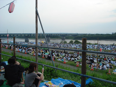 Публика начинает собираться задолго до начала фейерверка. В Нагаоке фейерверк проходил около реки Шинано (самой длинной реки Японии), и чем ближе мы подходили к месту проведения фейерверка, тем все чаще встречались такие спонтанно организованные места для пикника.